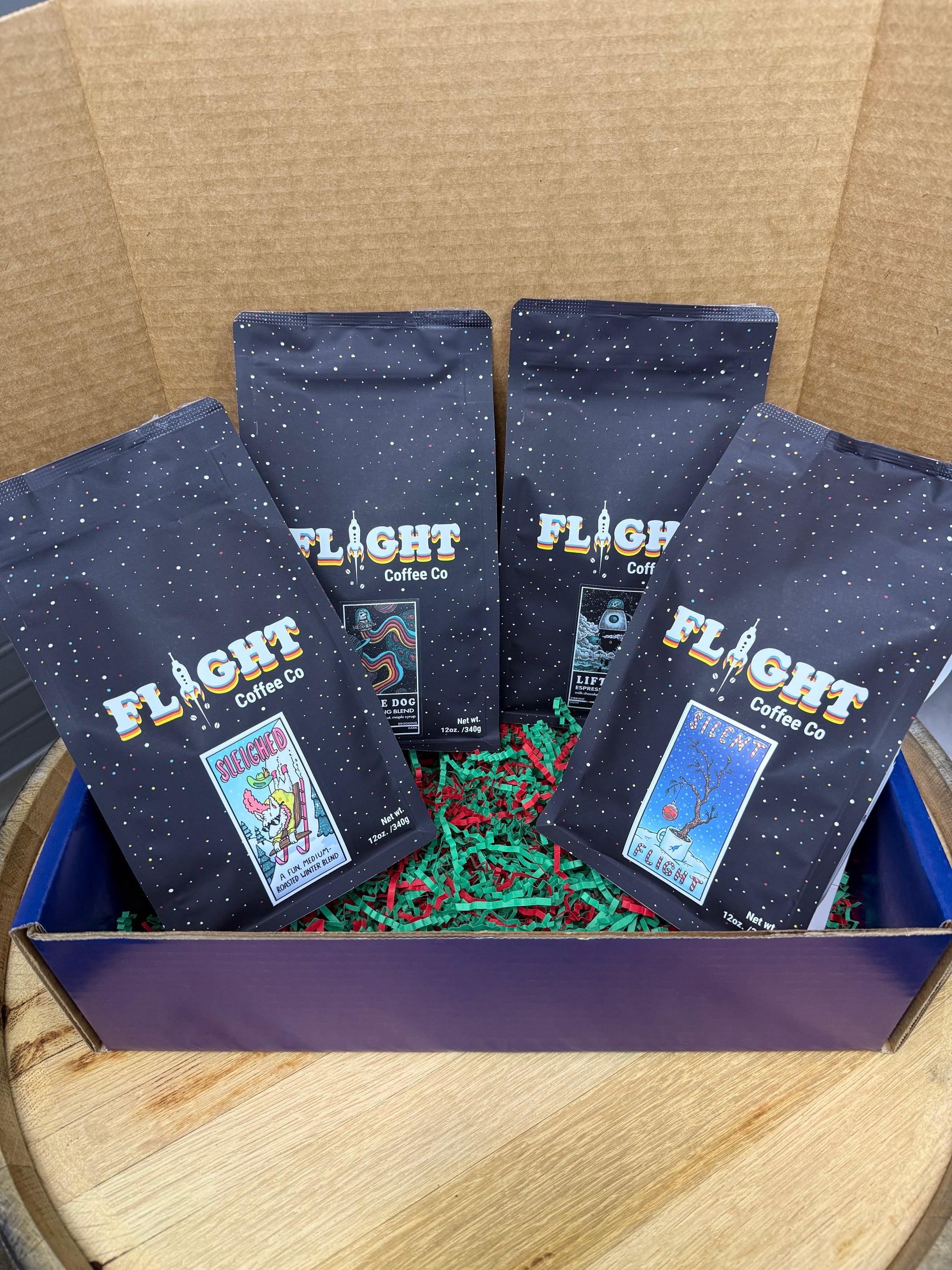 Includes our holiday blends, Silent Flight & Sleighed plus your choice of two other blends packaged in a Flight gift box (bow not included).