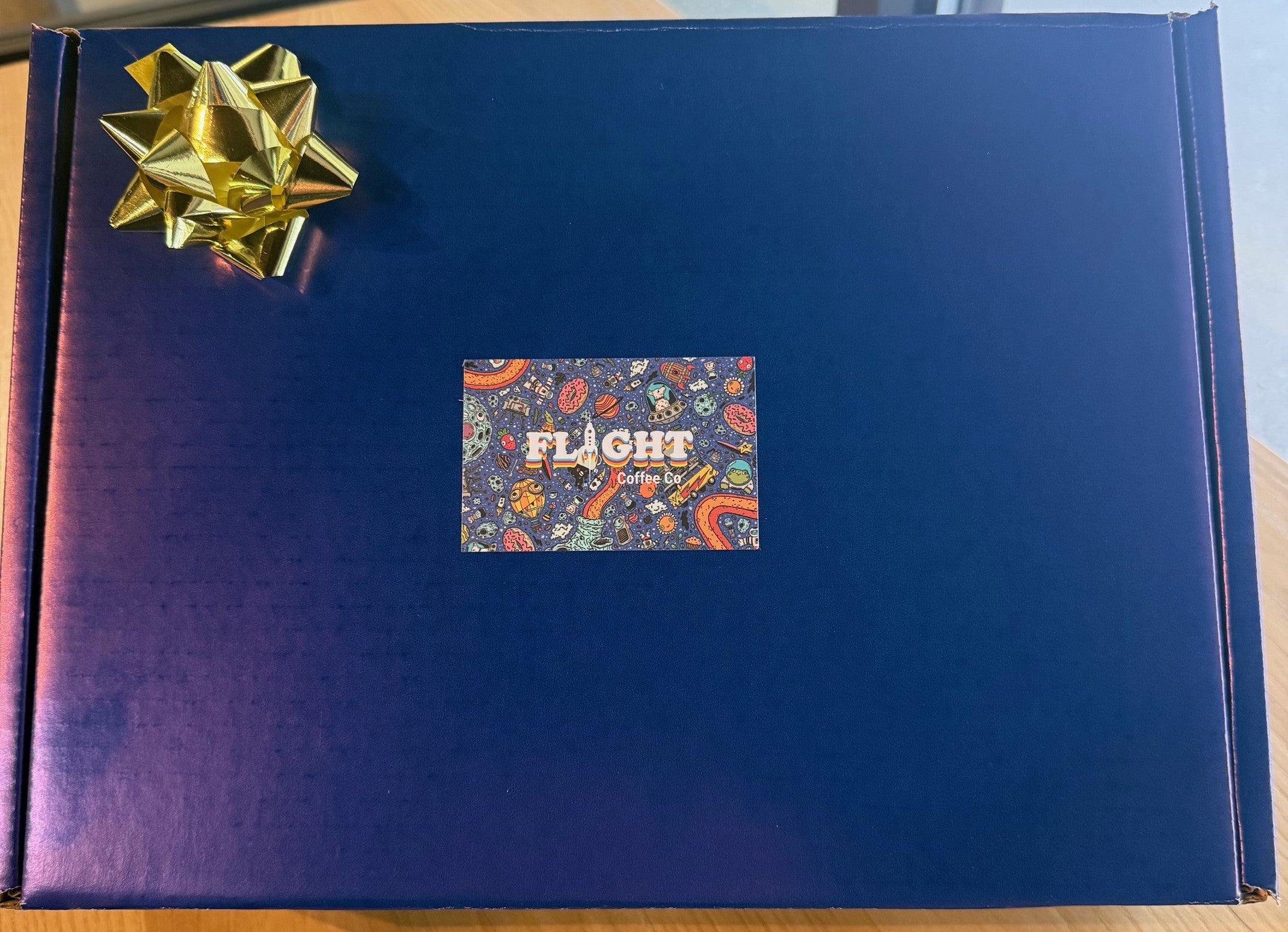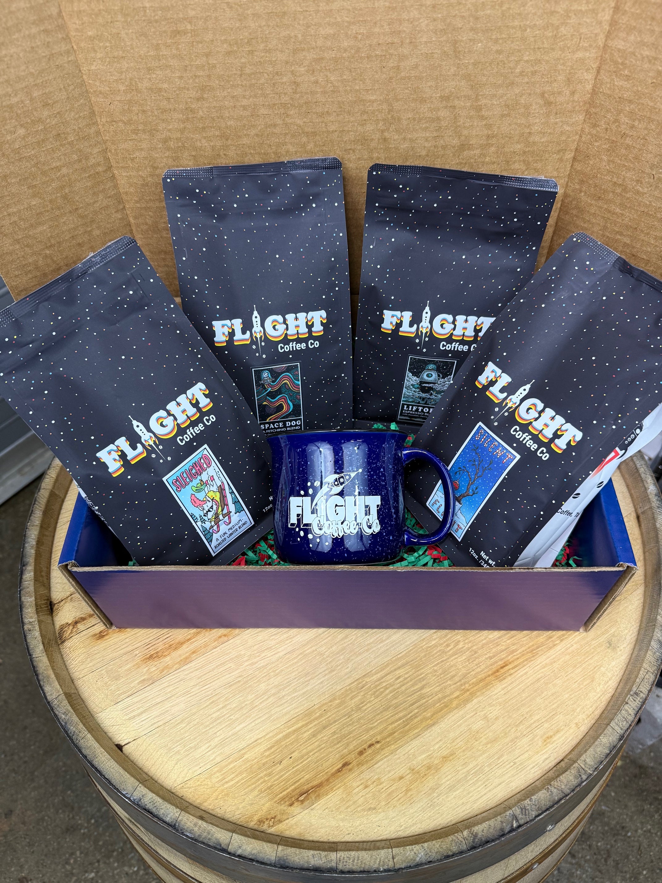 Includes a 15 ounce Flight Campfire Mug, our holiday blends, Silent Flight & Sleighed plus your choice of two other blends packaged in a Flight gift box (bow not included).